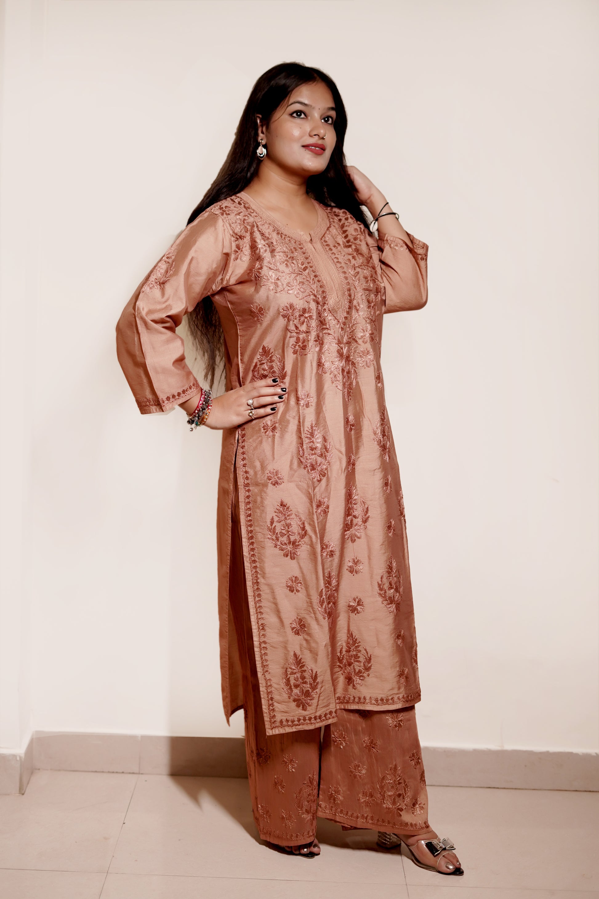 The Copper Brown Chanderi Kurta Set from Varnika Exclusive Chikan is crafted from premium Chanderi fabric for both kurti and palazzo, offering a lightweight and breathable fit. The straight kurti with 3/4 sleeves, paired with palazzo pants, creates a flattering silhouette. Hand-embroidered Chikankari adds authentic Lucknowi charm, making this set perfect for festive gatherings, office functions, or casual parties.