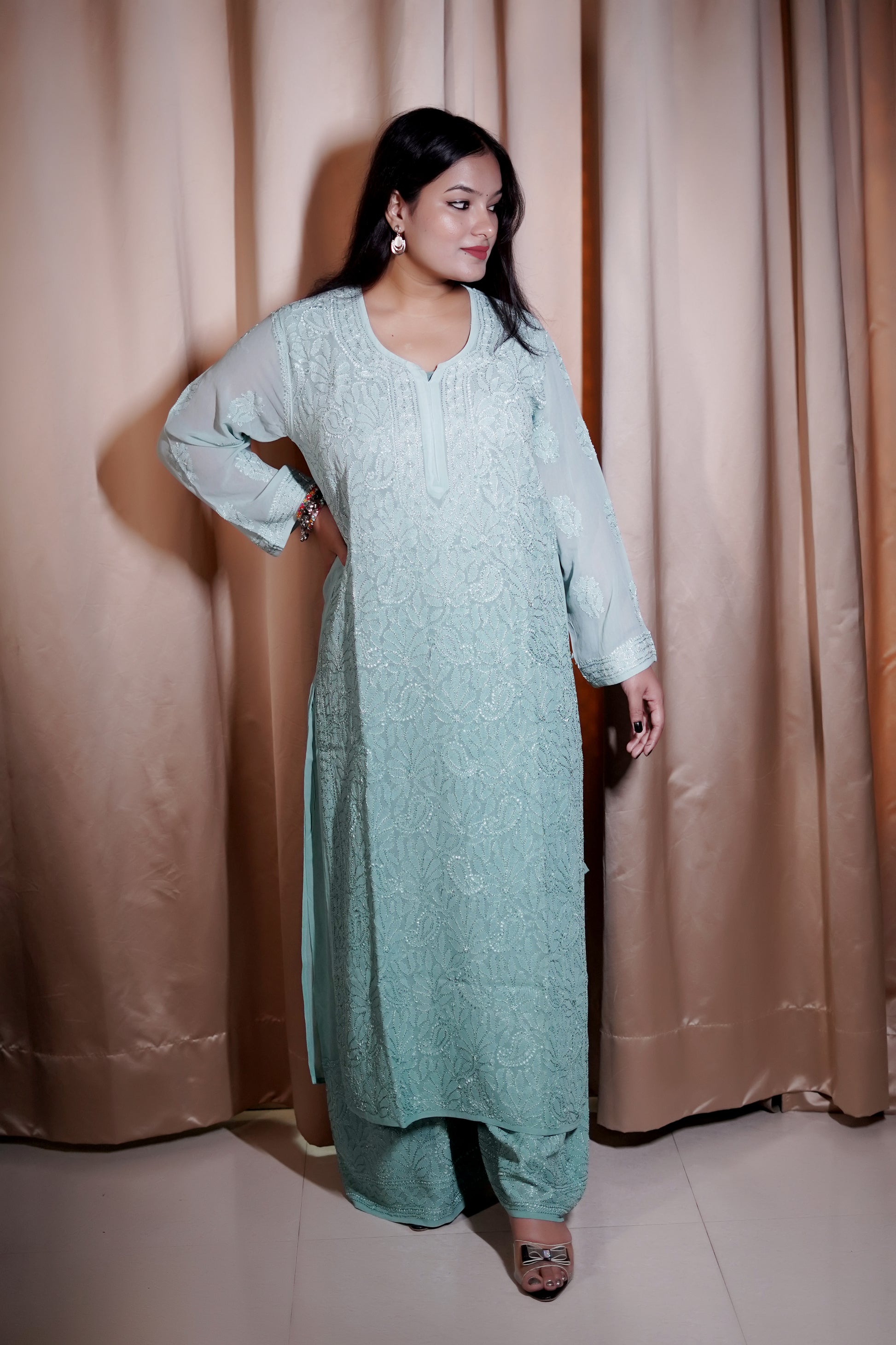 Experience serene elegance with this breathtaking Pastel Aqua Green Ombre Chikankari Kurta Palazzo Dupatta Set, crafted in premium viscose fabric that offers a smooth, graceful fall.