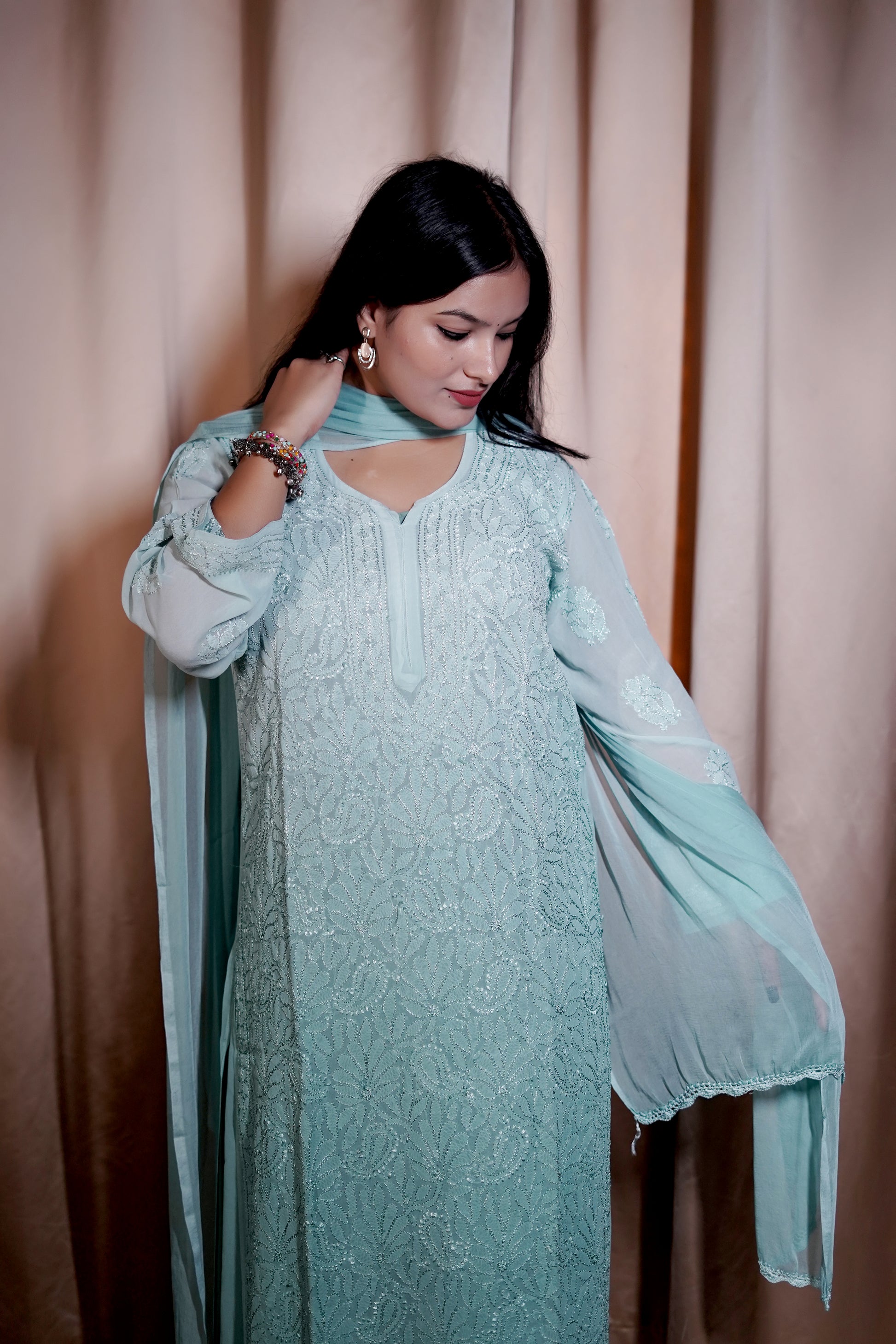 The soothing ombre transition—from soft aqua to a richer pastel green—adds a dreamy and refreshing charm to the ensemble. The kurta is adorned with intricate Lucknowi hand embroidery, featuring delicate floral and paisley motifs created using fine Resham threads. This handcrafted detailing, paired with subtle shimmer, elevates the outfit into a luxurious, festive-ready attire.