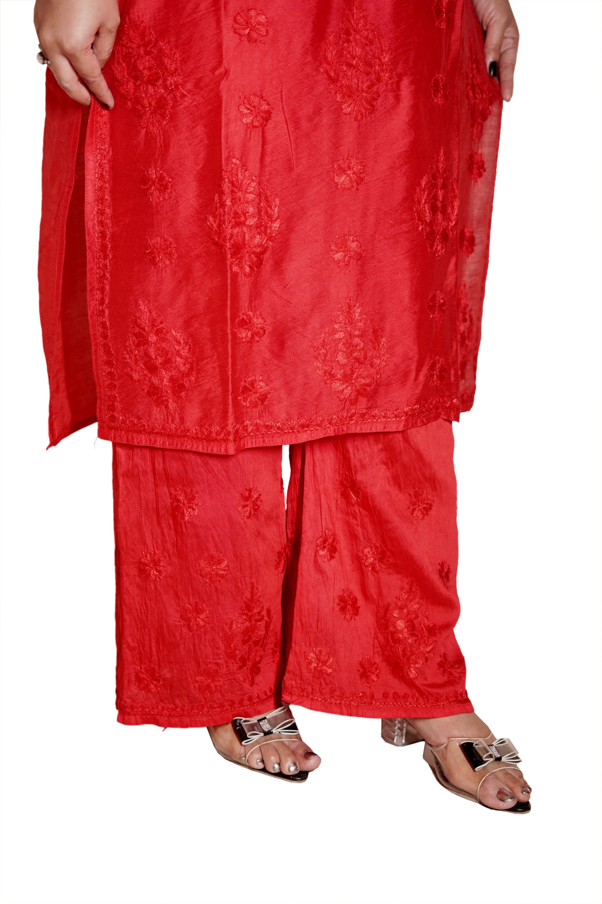 The Red Chanderi Kurta Set from Varnika Exclusive Chikan is crafted from premium Chanderi fabric for both kurti and palazzo, offering a lightweight and breathable fit. The straight kurti with 3/4 sleeves, paired with palazzo pants, creates a flattering silhouette. Hand-embroidered Chikankari adds authentic Lucknowi charm, making this set perfect for festive gatherings, office functions, or casual parties.