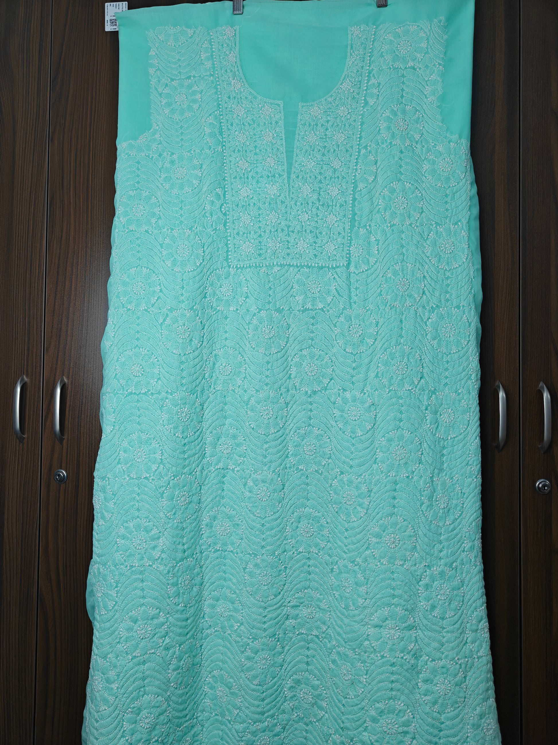 Add a refreshing touch of elegance to your wardrobe with this Sea Green Terivoil Cotton Hand-Embroidered Chikankari Suit Set from Varnika Exclusive Chikan.